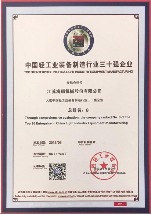 今日江蘇海獅機械股份有限公司榮獲了中國洗滌機械行業(yè)十強首位,中國輕工業(yè)裝備制造行業(yè)三十強企業(yè)第8位,中國輕工業(yè)科技百強企業(yè)第23位