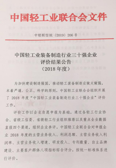 為加快建設強國,推動輕工裝備制造業(yè)做大做強,本著嚴謹、公正、科學的原則,中國輕工業(yè)聯(lián)合會組織開展了2018年度“中國輕工業(yè)裝備制造行業(yè)三十強企業(yè)”、“中國輕工業(yè)科技百強企業(yè)”評價工作。