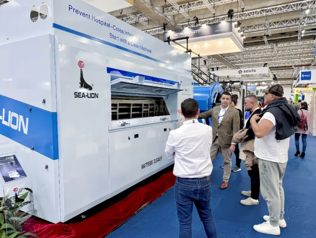 在2024法蘭克福國際紡織品專業(yè)處理展覽會(Texcare International 2024)的璀璨盛況中,11月6日這一天,德國法蘭克福展覽中心的8號展廳迎來了全球紡織業(yè)界的矚目焦點,為紡織處理行業(yè)繪制了一幅充滿創(chuàng)新與活力的未來圖景。NO.1 現(xiàn)場動態(tài)01 海獅現(xiàn)場在這場國際盛會中,江蘇海獅機械股份有限公司以其獨特的展位設計成為了展會